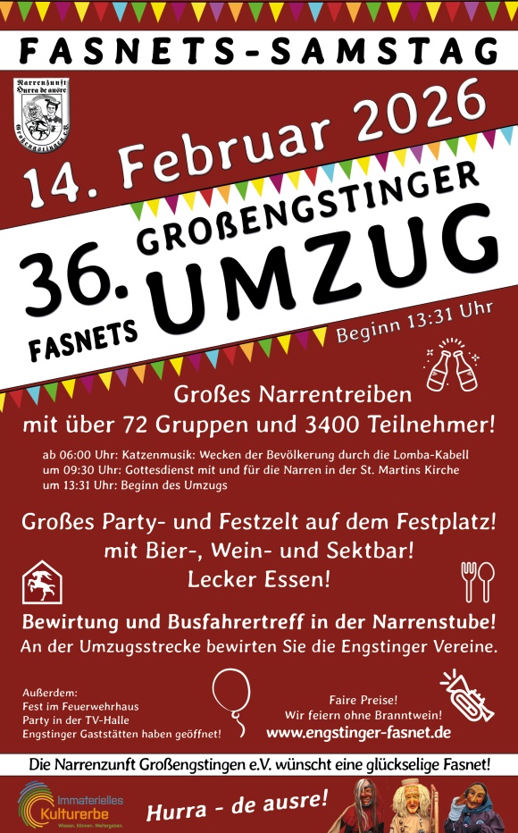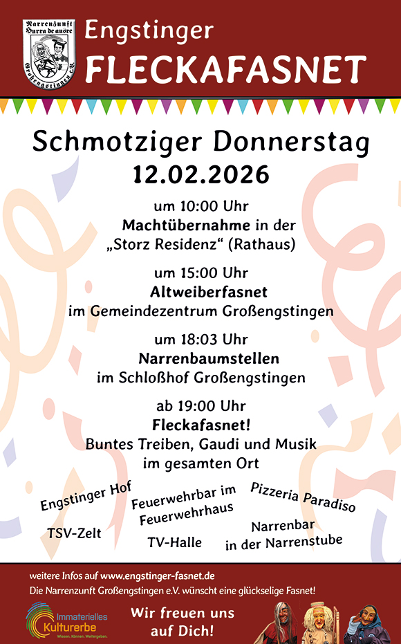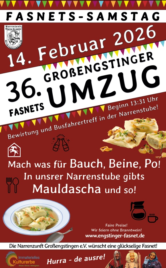 Bitte meldet eure Hexe (keine lebendigen) bis zum 05.02.26 unter hexhex@nz-grossengstingen.de mit Adresse und gerne auch mit Bildern! Unser Hexen-Gutachterausschuss wird die schönsten Hexen an der Fasnetsverbrennung prämieren und anschließend im Amtsblatt und Online veröffentlichen. Und natürlich gibt es wieder den traditionellen Sekt!